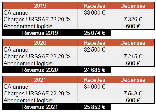 Exemple : vous êtes graphiste en BNC et vos seuls frais sont vos charges à l’URSSAF de 22,20% et un abonnement à un logiciel de 50€ par mois. Votre CA était de  25 000€ en 2019, 23 000€ en 2020, et 26 000€ en 2021.