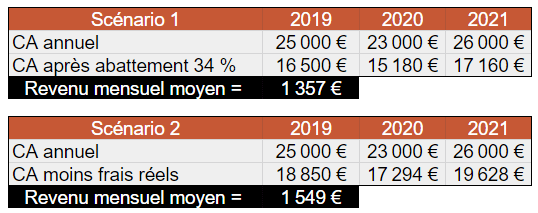 • celui correspondant à votre chiffre d’affaire mensuel moyen sur 3 ans – vos frais réels